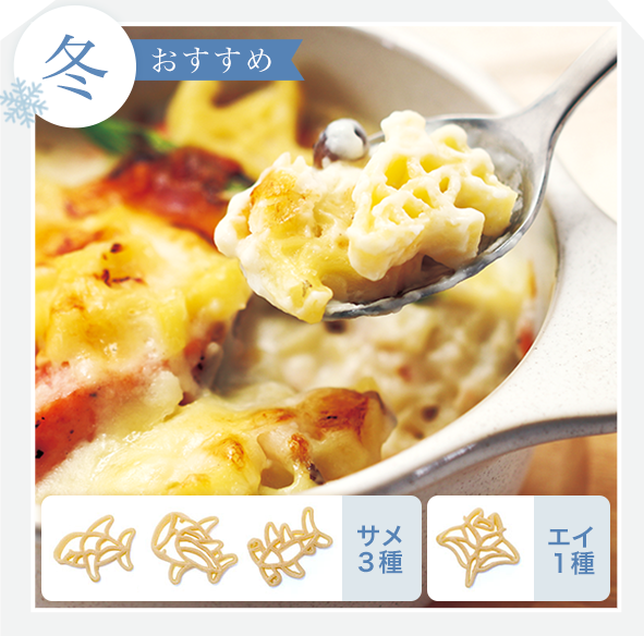 サメ3種とエイ1種の見た目も楽しい、美味しいパスタです。型崩れしにくいパスタで、お祝いやパーティでも活躍します。シャークパスタ¥691(税込)